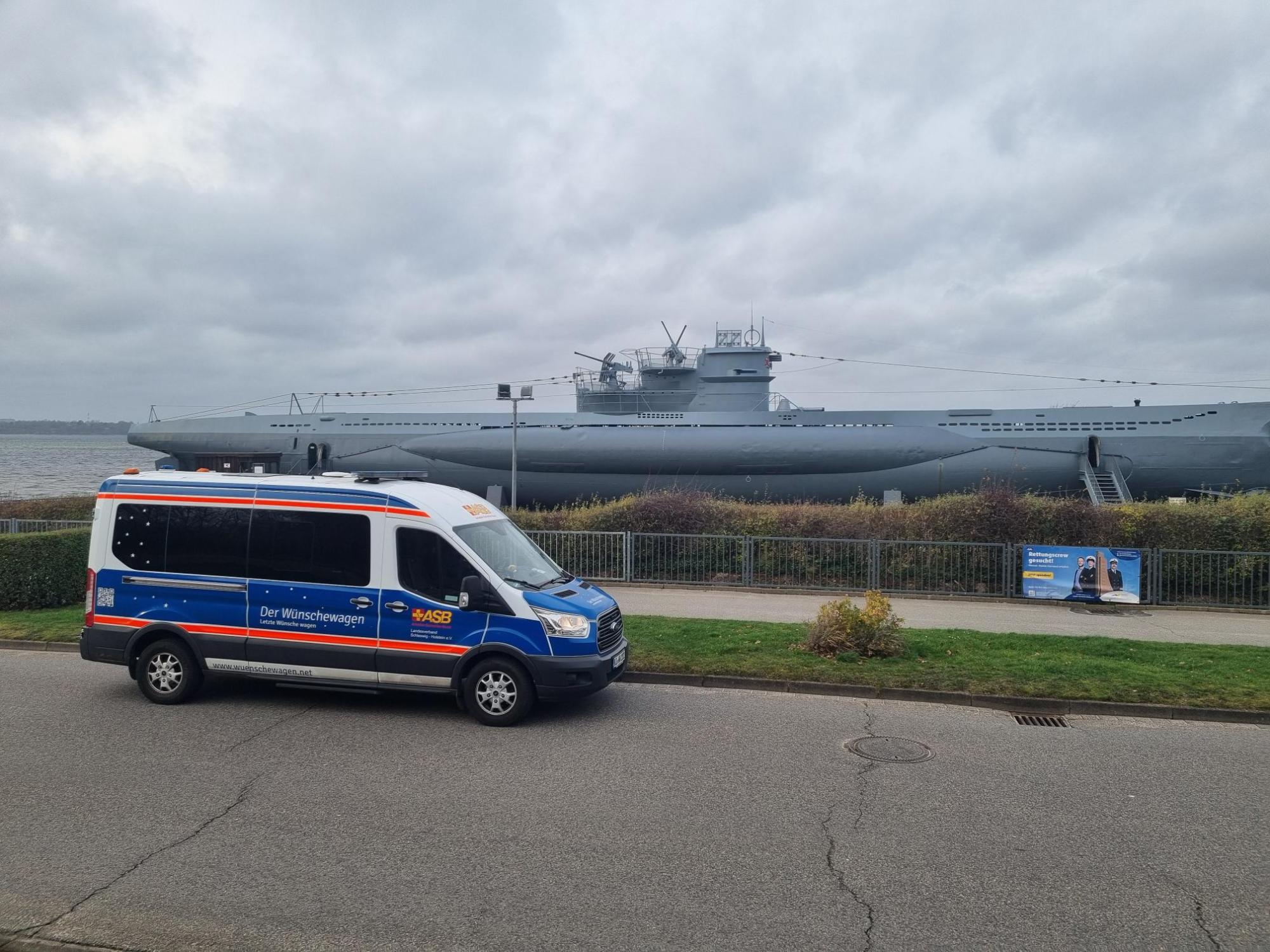 Als wir uns anschließend dem U-Boot nähern wollten, merkte man unserem Fahrgast die Erschöpfung an. Wir mussten schweren Herzens diesen Programmpunkt streichen, konnten aber noch mit dem Wünschewagen möglichst nah an das U-Boot fahren, sodass er es von außen bestaunen konnte.
