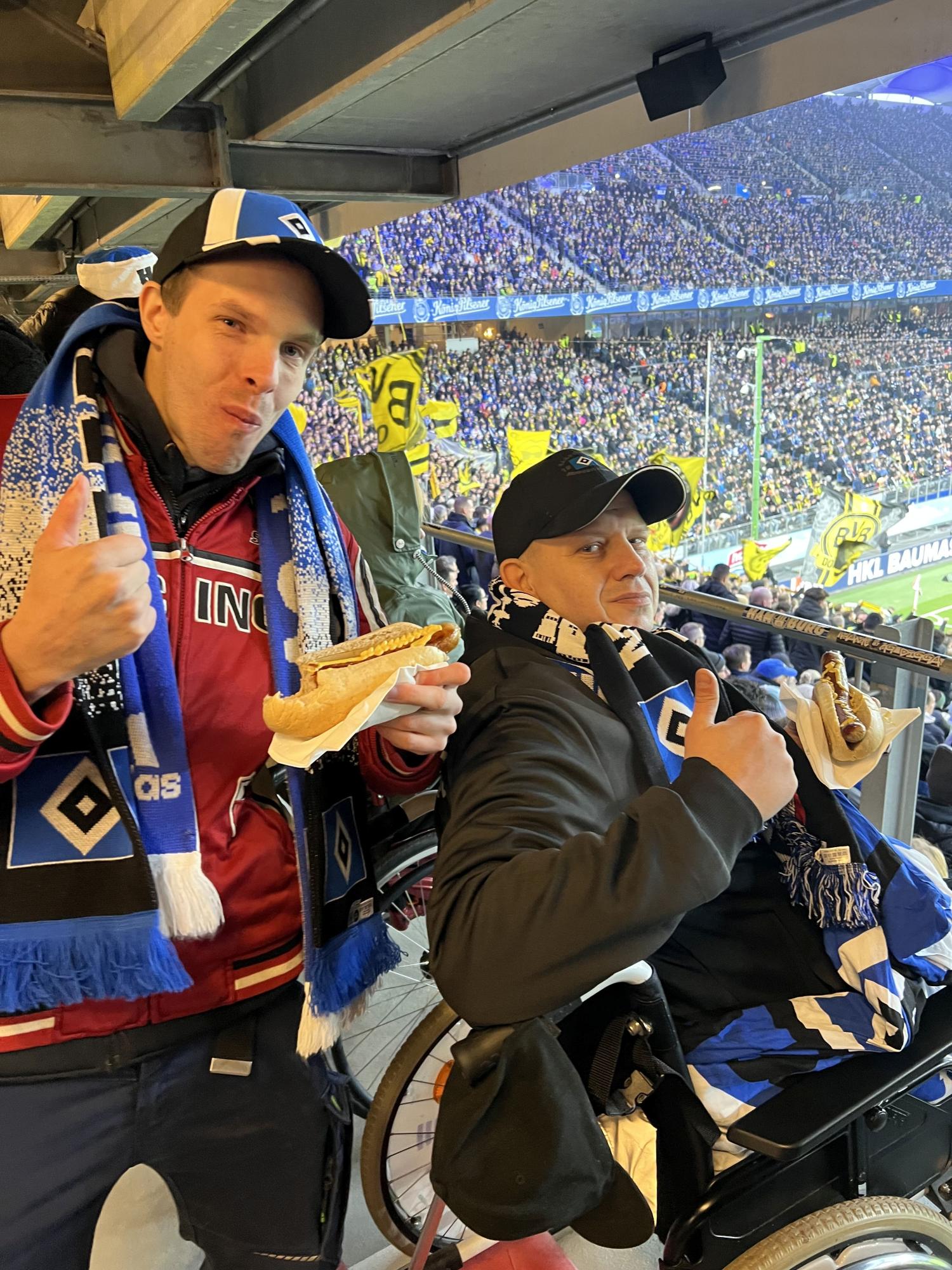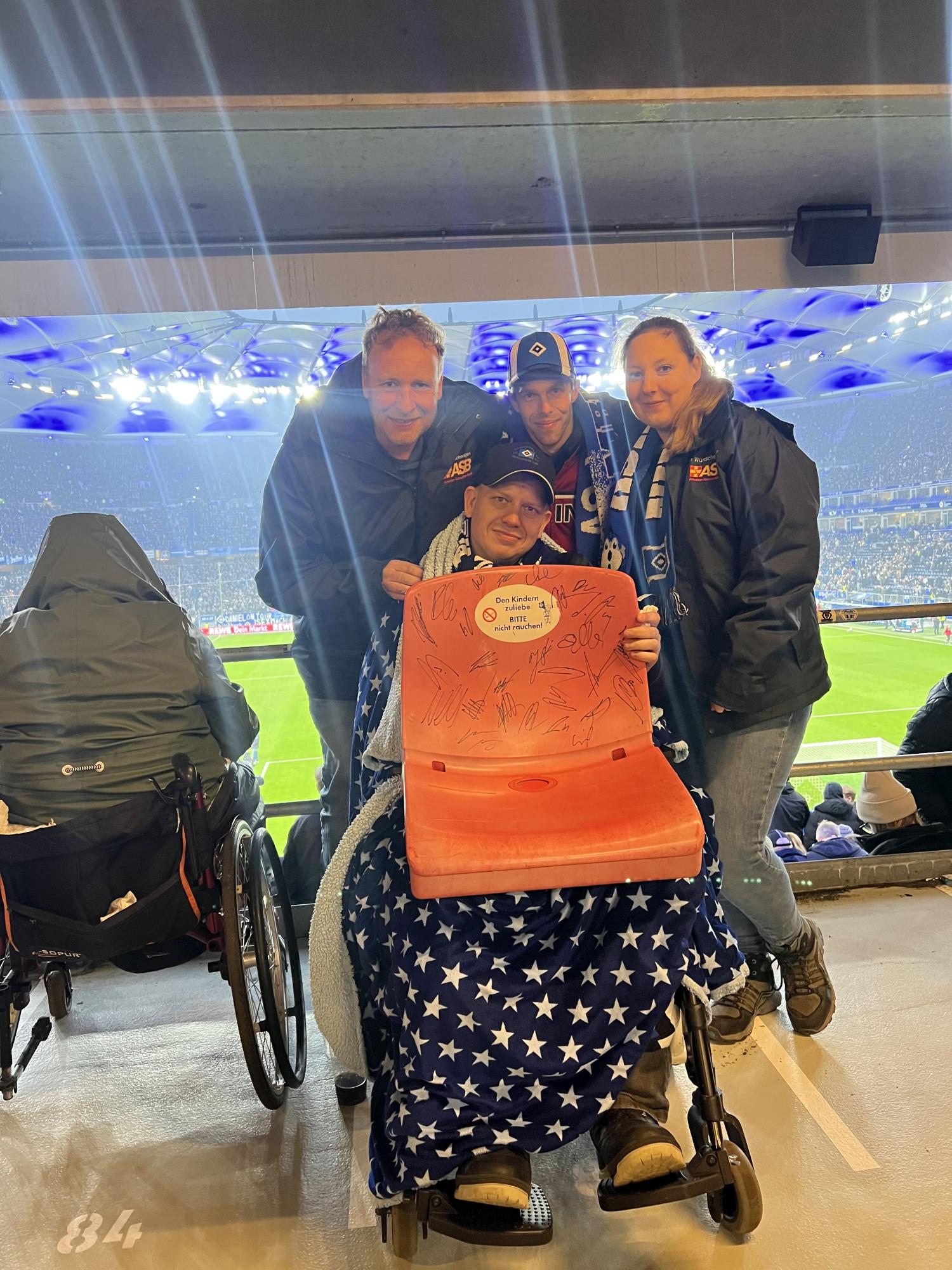 Dennis, eingefleischter HSV-Fan aus Bad Segeberg, hat sich schon die ganze Woche auf das ausverkaufte Spiel gegen die Borussen aus Dortmund gefreut. So machten sich die Wunscherfüller Alex und Lars auf den Weg nach Bad Segeberg, um mit Dennis und seinem Bruder Nils am Samstagnachmittag die Rothosen anzufeuern. Der Wünschewagen wurde natürlich mit HSV-Bettwäsche vorbereitet, sodass die Vorfreude auf ein tolles Spiel groß war. Vor dem Spiel wurden wir sehr nett von dem HSV-Integrationsteam empfangen. Dennis bekam einen Stadionsitz, der von allen Spielern des HSV signiert wurde. Eine tolle Erinnerung und ein tolles Geschenk! Dann der Anpfiff: Dennis und Nils feuerten kräftig, gestärkt nach einer Stadionbratwurst, ihren HSV an. Ein ausgeglichenes Spiel bis zur 64. Minute! Doch dann kassierte der HSV den Gegentreffer. Aber die HSV-Kicker hielten sich wacker und konnten in der 7. Nachspielminute der zweiten Halbzeit einen Ausgleich erzielen. Die Stimmung im Stadion und bei Dennis und Nils war dann natürlich überwältigend. Eine richtig tolle Atmosphäre! Mit diesem guten Gefühl machten wir uns nach dem Schlusspfiff auf den Rückweg nach Bad Segeberg. Sicher feierten die beiden Brüder dann noch den mehr als verdienten Ausgleich ihres HSV.