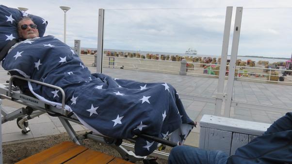 Da die Kraft zum Sitzen fehlte, ging es auf Wunsch des Gastes per Fahrtrage auf der Promenade am Wasser entlang. Am Maritim Hotel, wo das Ehepaar immer so gerne Urlaub gemacht hat, das Einlaufen der Schiffe zu beobachten, war für den 79-Jährigen das Highlight.
